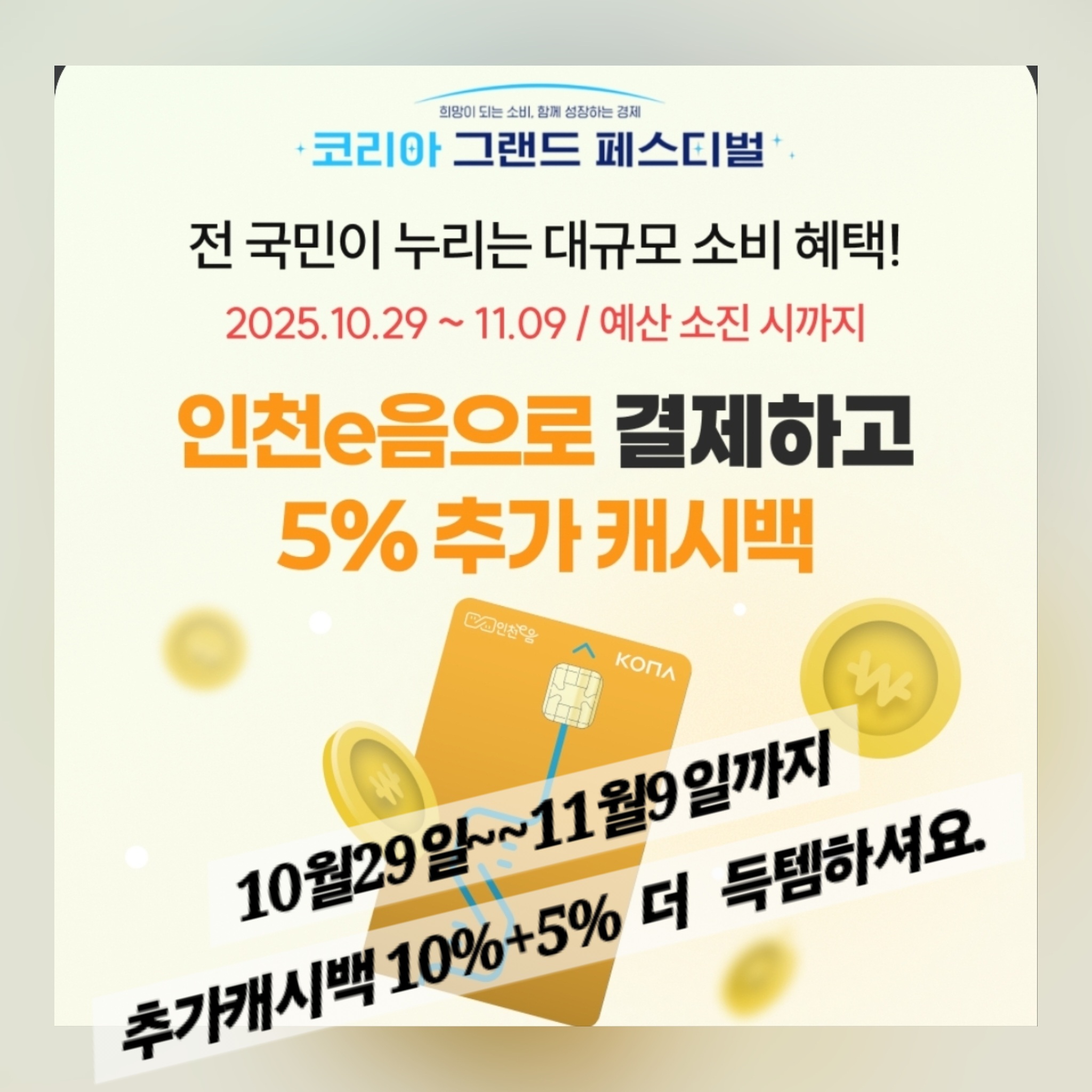 # 코리아그랜드페스티벌기간 10월29일~~~11월9일까지 이음결제시 10%+ 추가5%지급<송도잭과콩나무>